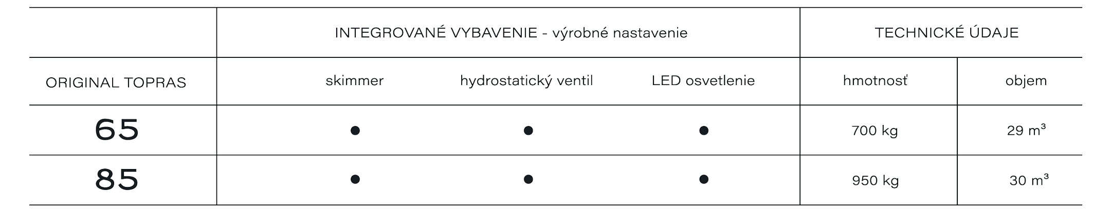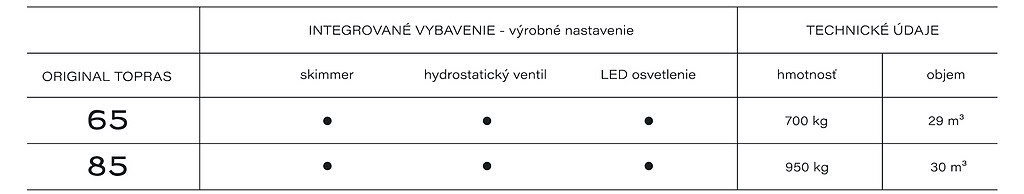 Dizajn a funkčnosť dopĺňajú integrované prvky, ako integrovaný skimmer pre vysokú hladinu vody, možnosť riešenia integrovaného roletového prekrytia pre bezpečnosť a efektívnosť a praktický protišmyk na dne bazéna pre štýl aj bezpečnosť. Povrchová úprava (gelcoat) je navrhnutá tak, aby bola odolná voči chémii a UV žiareniu a dlhodobo si zachovávala farbu.