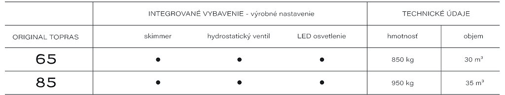 Dizajn a funkčnosť dopĺňajú integrované prvky, ako integrovaný skimmer pre vysokú hladinu vody, možnosť riešenia integrovaného roletového prekrytia pre bezpečnosť a efektívnosť a praktický protišmyk na dne bazéna pre štýl aj bezpečnosť. Povrchová úprava (gelcoat) je navrhnutá tak, aby bola odolná voči chémii a UV žiareniu a dlhodobo si zachovávala farbu.